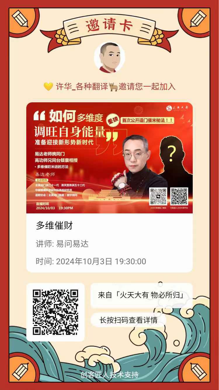 明晚七点半,他将于高功道长一起,进行提高能量,多维催财为主题的免费直播,大家点击 https://a.ckjr001.com/6wOjmQ/3vyn96j 链接,微信扫描登陆小程序预约,或者直接微信扫描下图片登陆预约。