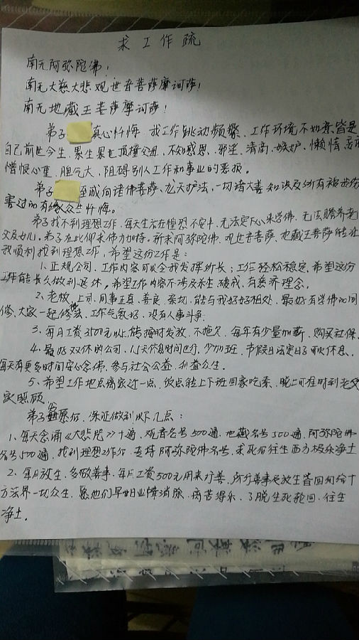 后面在论坛看见有些师兄发《求工作疏》能迅速找到工作,便按着格式写了一份(详细见下图),用一本簿子每天记着自己动作的过程。另一位师兄也安慰我说,念佛是正行,放生是助行,叫我努力念佛放生,很快就有感应。