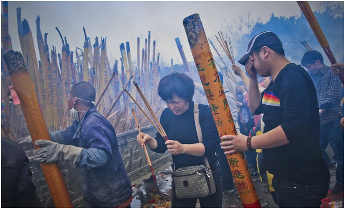 如果人很多时,将香直竖向上,以免烧到他人,然后走到距佛像三步远的距离,举香观想拜佛。