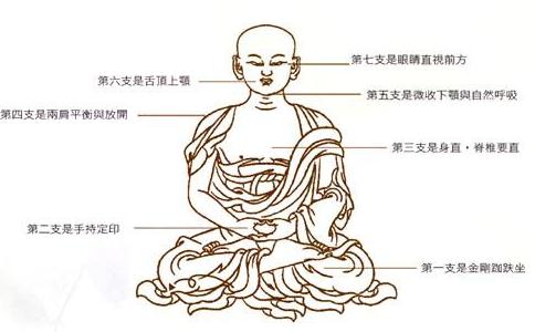 头须自然正直,忌僵硬。挺起胸膊,端身正坐,身不弯曲,也不高耸,头不低垂,也不昂仰,脊骨要直,总之,不可东倒西歪,身坐不正,气血不通,气血不通以至心难入定。