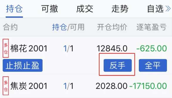 通常这个操作我们选择在:市场价格波动和我们持仓完全不一致的时候,期货行情波动太大,自己做出的判断出现失误想要快速补救的时候。面对剧烈波动的行情,我们借助期货杠杆可以获得高额的利润,甚至巨大的亏损,因此“反手”这个按键就可以有效地简化我们的操作步骤,帮助我们快速完成操作。