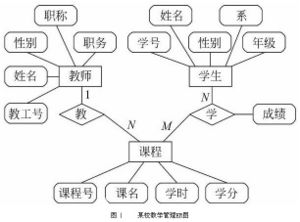 通常,使用实体-联系图(entity-relationship diagram)来建立数据模型。可以把实体-联系图简称为ER图,相应地可把用ER图描绘的数据模型称为ER模型。ER图中包含了实体(即数据对象)、关系和属性等3种基本成分,通常用矩形框代表实体,用连接相关实体的菱形框表示关系,用椭圆形或圆角矩形表示实体(或关系)的属性,并用直线把实体(或关系)与其属性连接起来。例如,图1是某学校教学管理的ER图。