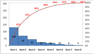 它把收集的数据,以不良原因(状况)等作为项目区分标准,找出比例最大的项目,并按照从大(多)到小(少)排列,配上累积值的一种图形。