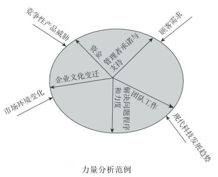 比如,在实施产品研究开发计划时就可以按照上述步骤来分析内部力量和外部力量。外部力量包括竞争性产品的威胁,顾客的需求,市场变化、科技发展等。内部力量包括资金、管理层的承诺和支持、企业文化、团队力量、解决问题的程序和力度等。如下图所示。