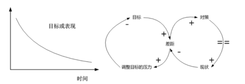 图解中,左边回路是降低目标回路,容易达成;右边是改变现状回路,即便干预措施有效,通常也存在延迟反应,较难达成。