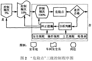 下面给出一个嵌套制的案例,并通过此案例阐述嵌套制的原理。图2为企业“危险点”三级控制程序图,它由3个相对完整的闭环控制系统嵌套而成。图2中虚线框内是一个典型的岗位闭环控制系统:控制主体是“岗位”,控制对象是“危险点”,控制(行为)依据是“安全规程、操作规程、工艺规程和检查表”。
