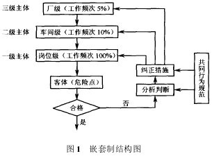 如图2所示,在岗位闭环控制系统的基础上增加车间的安全职能人员“车间安全员”,于是就形成了车间闭环控制系统:控制主体是“车间安全员”,控制对象是“岗位”的“工作表现”和“危险点”,控制(行为)依据与岗位闭环控制系统相同。在车间闭环控制系统的基础上再增加厂的安全职能部门“安全处”,于是又形成了厂级闭环控制系统:控制主体是“安全处”,控制对象是“车间安全员”、“岗位”两者的“工作表现”和“危险点”,控制(行为)依据与前述两个闭环控制系统相同。本案例是同时采用行为嵌套和系统嵌套的具有三级嵌套特征的嵌套制。