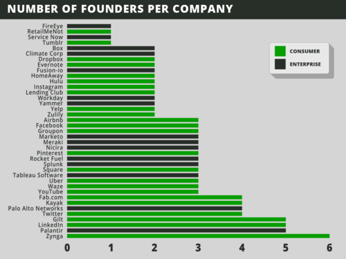 ·有四家独角兽公司的创业者是单枪匹马(ServiceNow, FireEye, RetailMeNot, Tumblr——一半企业类,一半消费类),这四家公司均有各自的“变现机会”,市值也要比创始人是多位的公司更高。