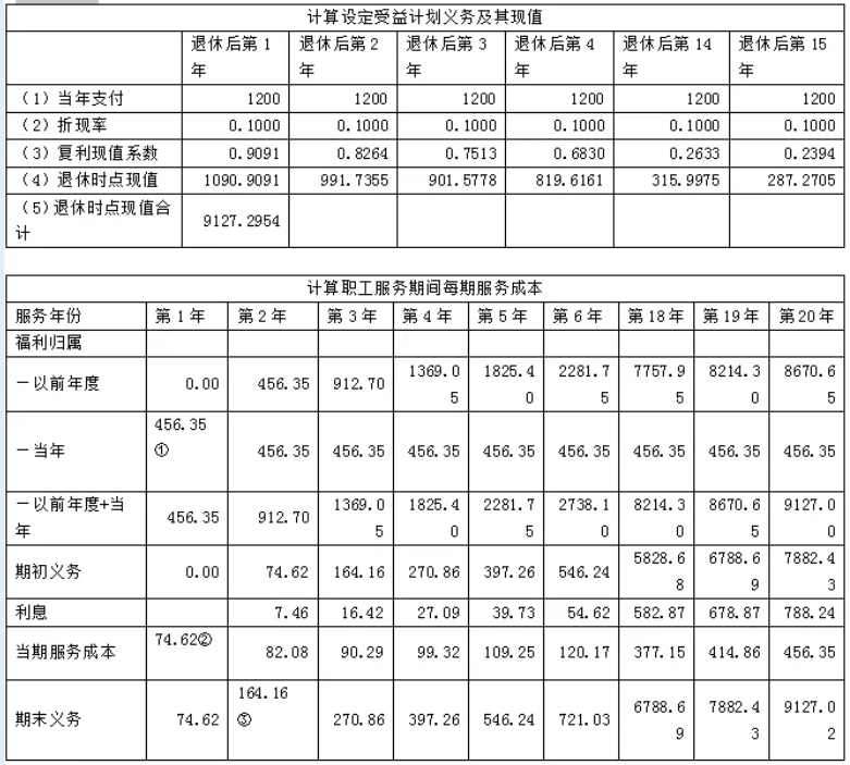 2、职工获得该额外退休金基于该计划开始日期为公司提供的服务,而且应当自该设定受益计划开始日期起一直为公司服务至退休。假定符合条件的100人,当前平均年龄40岁,退休年龄60岁,还可以服务20年,假定退休后人均领取15年,折现率10%。