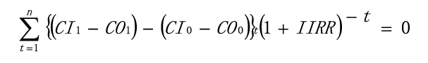 式中:IIRR—增量财务内部收益率;n—项目计算期;CI1—有项目现金流入;CO1—有项目现金流出;CI0—无项目现金流入;CO0—无项目现金流出。