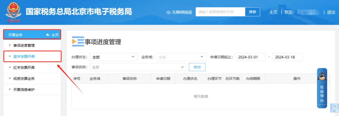 登录电子税务局后请点击【我要办税】—【开票业务】—【蓝字发票开具】,点击“可用发票额度”旁【去调整】按钮,进入发票额度调整申请界面。也可通过【我要办税】—【税务数字账户】—【发票额度调整申请】进入该界面;