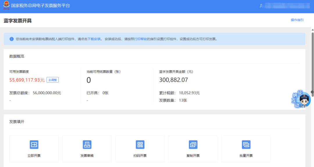 在电子税务局主页依次点击【我要办税】—【开票业务】—【蓝字发票开具】,进入后可以看到可用发票额度,这个额度就是您企业可开的数电票总额度。