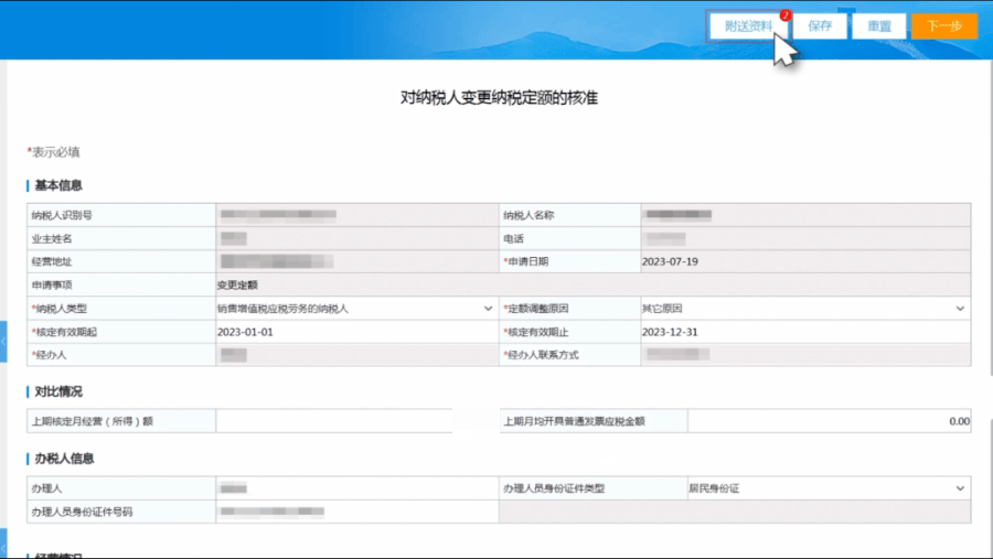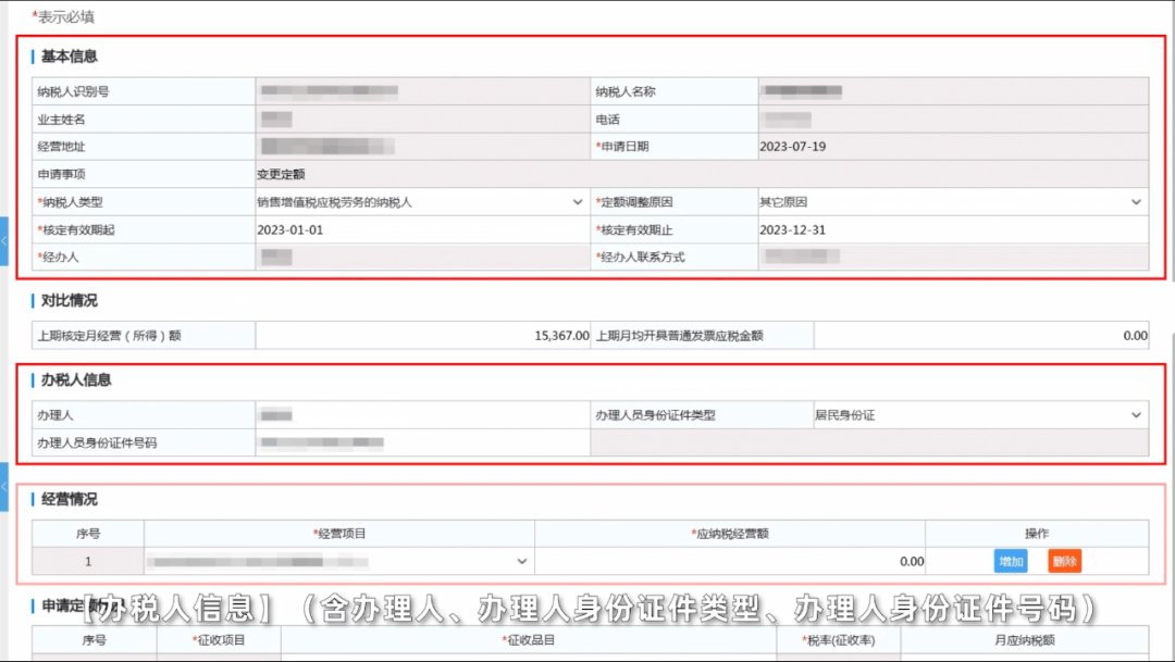 2依次选填或填写【基本信息】(含纳税人类型、定额调整原因)、【办税人信息】(含办理人、办理人身份证件类型、办理人身份证件号码)、【经营情况】(含经营项目、调整后的应纳税经营额)。