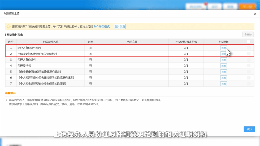 3点击【附送资料】,上传经办人身份证原件和变更定额的相关证明资料,点击【确定】,再点击【下一步】,即可完成定期定额核准变更申请。