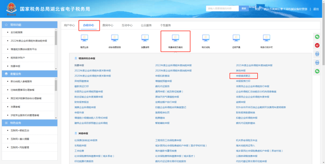 点击【办税中心】-【税费申报及缴纳】-【申报错误更正】。