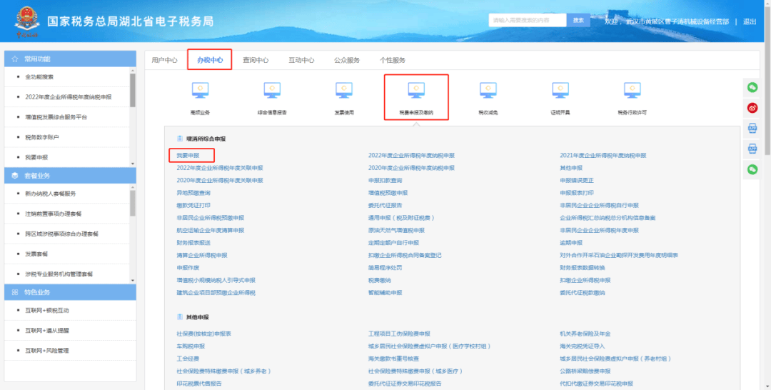 点击【办税中心】-【税费申报及缴纳】-【我要申报】。