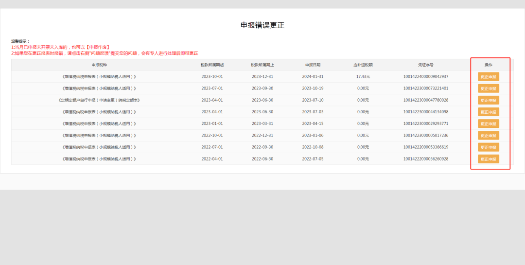 (注意:若未查询到需要更正的税款所属期及申报税种,则需要到窗口进行更正申报。)