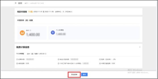 2.纳税人可通过“税费计算信息”栏次查看详细的计算数据,也可点击【预览报表】进入申报表预览详情,预览“增值税及附加税费申报表”和“定期定额纳税申报表”,确认无误后点击【提交】完成申报。