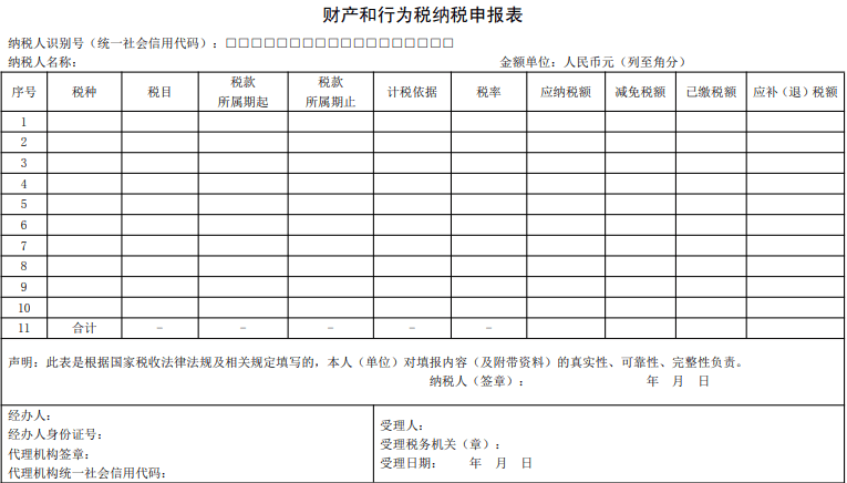 财产和行为税是现有税种中财产类和行为类税种的统称。财产和行为税合并申报,又称为“十税合一”,通俗而言就是“简并申报表,一表报多税”,纳税人在申报多个财产和行为税税种时,不再单独使用分税种申报表,而是在一张纳税申报表上同时申报多个税种。