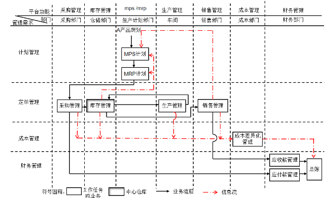 业务部门在收到执行计划后,会通过定单完成。例如采购部门会按照A产品的需求,先采购原材料,即执行采购定单;然后再将原材料生产为A产品,即执行生产定单;最后将A产品销售给客户,即执行销售定单。