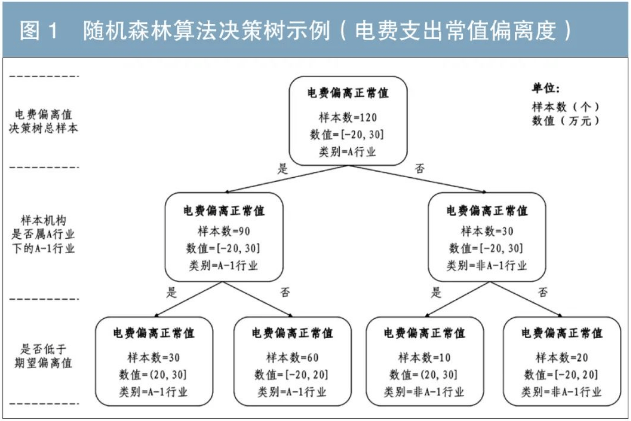 以随机森林算法2为例,债券市场基础设施等机构可探索基于企业在水电消耗、舆情动态、租金缴纳等领域的行为特点构建多棵决策树,并应用随机森林预测模型对高收益债券发行人的发展潜力与违约风险进行识别,在传统的发行申报材料之外为投资者提供参考信息。譬如,在电费支出方面,可根据业界一般经验形成如下算法决策树(见图1),并在数值偏移超出阈值时进行预警;同时,对于异常情况也可进一步分级分类,同其他指标的研判与分类结果共同构成发行人的企业风险画像。