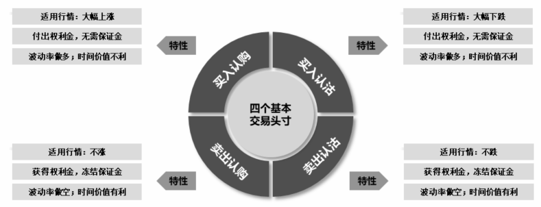根据期权约定的交易方向,期权可以分为认购期权和认沽期权。期权交易的开仓方式有买入开仓和卖出开仓。因此,期权的四种基本交易为:买入认购、卖出认购、买入认沽、卖出认沽。买入开仓的持仓称为权利仓,卖出开仓的持仓称为义务仓。买入认购适用大涨的行情,买入认沽适用大跌的行情,卖出认购适用不涨的行情,卖出认沽适用不跌的行情。