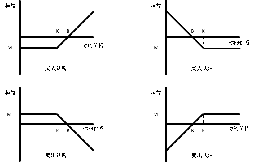 注:M为期权权利金,K为期权行权价,B为盈亏平衡点