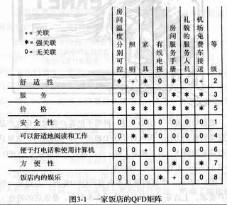 图3-1表示一个说明最基本内容的QFD矩阵,左边是一些客户要求,上边是一些产品特性(在本例中,是饭店的特性)。在交叉方块中,"+"号表示在特性与要求之间有积极的关联关系,"*"表示有很强的积极关联关系,"0"表示没有关联关系。另外,也有消极的关联关系,在本例中没有出现。右边是客户要求的排序,是最重要的,该排序通过客户调查、面谈等得到。