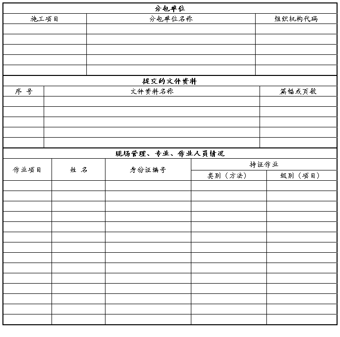 填写与设备施工相关的必须持证的人员。包括无损检测、焊接等人员,但不包括与设备施工无关的单位其他持证人员。页数不够,可另附页。